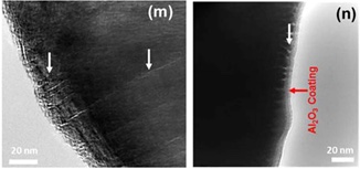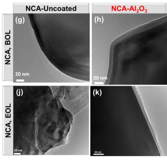 納米級的包覆涂層可以有效維持電極材料的穩(wěn)定性,在橡樹嶺國家實驗室團(tuán)隊與 Forge Nano 的一項研究中,使用中試級流化床系統(tǒng) Al2O3 包覆后,三元正極材料在循環(huán)后可保持更穩(wěn)定的結(jié)構(gòu),同時減少其相變以及相應(yīng)的裂紋擴(kuò)展。