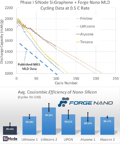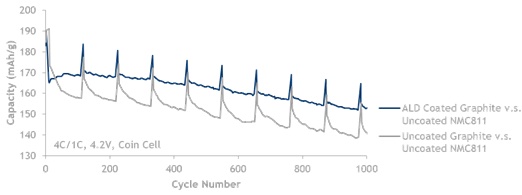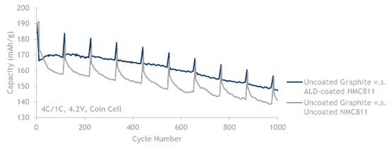 較高的充電電壓往往會引起更多的副反應(yīng),削弱電極的穩(wěn)定性。Forge Nano 的 ALD 工藝可以防止過度金屬遷移,從而防止活性材料溶解和電池容量損失,在電池循環(huán)時保持低電阻。此外,ALD 涂層還通過降低電池放電和充電過程中鋰嵌入 / 脫嵌的能量勢壘,從而提高鋰離子導(dǎo)電性。降低電池電阻的反過來會促使電池壽擁有更高的容量保持率。