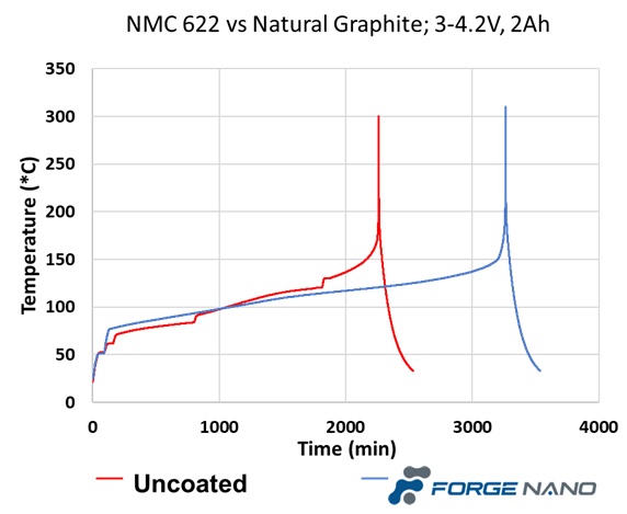 ARC 測試中 ALD 包覆的電池自生熱更慢,且失控溫度更高