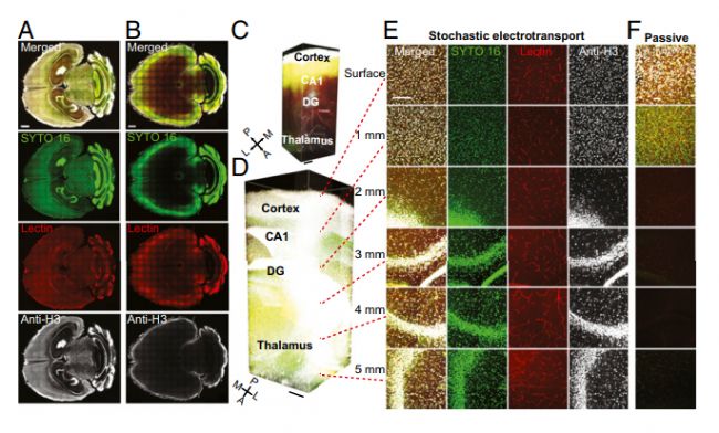 SmartLabel儀器在進(jìn)行樣品染色的時(shí)候可實(shí)現(xiàn)從樣品表面到樣品核心的均勻抗體標(biāo)記,除此之外,該儀器還具備快速,簡便,高效等優(yōu)點(diǎn)。與被動(dòng)染色相比標(biāo)記完整的大組織樣本要快一個(gè)數(shù)量級(jí),通常被動(dòng)染色需要數(shù)周完成的實(shí)驗(yàn),而利用SmartLabel儀器僅需要2-3天即可完成,大大縮短了實(shí)驗(yàn)時(shí)間。在實(shí)驗(yàn)的過程中用到的試劑有緩沖液和抗體或染料,且儀器是雙倉設(shè)計(jì),可以同時(shí)進(jìn)行2個(gè)不同的標(biāo)記實(shí)驗(yàn)。儀器獨(dú)特的設(shè)計(jì)也使抗體或染料的用量大大降低,一個(gè)小鼠腦的抗體用量可以低至3ug。綜上,SmartLabel儀器將會(huì)使您的免疫染色實(shí)驗(yàn)變得更簡單,高效。