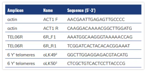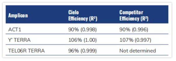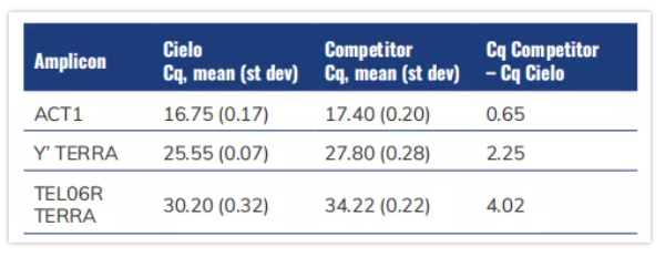在高豐度Actin和低豐度6Y’端;虻臋z測中,Azure Cielo™實(shí)時(shí)熒光定量PCR系統(tǒng)和同類產(chǎn)品的擴(kuò)增效率非常相似(表2)。然而,在單拷貝TEL06R端粒基因的檢測中,發(fā)現(xiàn)同類產(chǎn)品得到的Cq值偏大,位于35-38之間,導(dǎo)致計(jì)算出的擴(kuò)增效率大于200%,不能作為參考數(shù)據(jù);Azure Cielo™實(shí)時(shí)熒光定量PCR系統(tǒng)則計(jì)算得出E=96%(表2)。