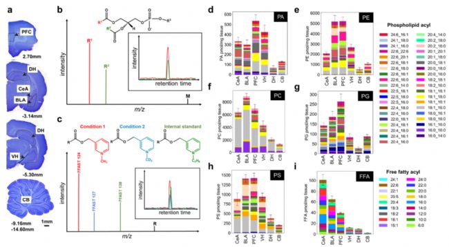 分別采用兩種互補(bǔ)的脂質(zhì)組學(xué)技術(shù)檢測大鼠腦組織中磷脂和 FFA 的變化。FFAST 使用微分穩(wěn)定同位素標(biāo)記法標(biāo)記 FFA 的羧基,對(duì)大鼠大腦 6 個(gè)區(qū)域的 18 種FFA進(jìn)行靶向定量獲得 FFA 濃度(pmol/mg);在磷脂分析方面,使用負(fù)離子模式ESI-MS,將磷脂生成前體離子sn-1/sn-2酰基片段。用冷的人工腦脊液灌注以減少缺血和死后脂質(zhì)代謝,從解剖組織(中央杏仁核、基底外側(cè)杏仁核、前額葉皮層、腹側(cè)海馬、背側(cè)海馬和小腦)中分別提取 FFA 和磷脂并進(jìn)行獨(dú)立分析(圖 1a-b)。堆積條形圖展示了 FFA 和 5 類磷脂(磷脂酸-PA、磷脂酰膽堿-PC、磷脂酰乙醇胺-PE、磷脂酰甘油-PG 和磷脂酰絲氨酸-PS)的平均濃度(圖 1d-i)。結(jié)果表明,F(xiàn)FAs和磷脂在大腦區(qū)域中分布不均;相對(duì)于組織重量,杏仁核和前額皮質(zhì)的濃度最高,海馬背側(cè)和小腦的濃度最低。飽和FFAs(6:0–24:0)占大腦各區(qū)域FFAs的絕大部分,其中PC和PE在整個(gè)大腦中的含量最高。