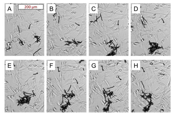 圖2 A-H生動地展示了同一個(gè)位置點(diǎn),U87細(xì)胞模型在24小時(shí)監(jiān)測下的動態(tài)變化。在監(jiān)測過程中,U87細(xì)胞會附著在呈啞鈴形的PCL顆粒上,進(jìn)一步遷移聚集形成啞鈴簇狀結(jié)構(gòu),并繼續(xù)進(jìn)行增殖。