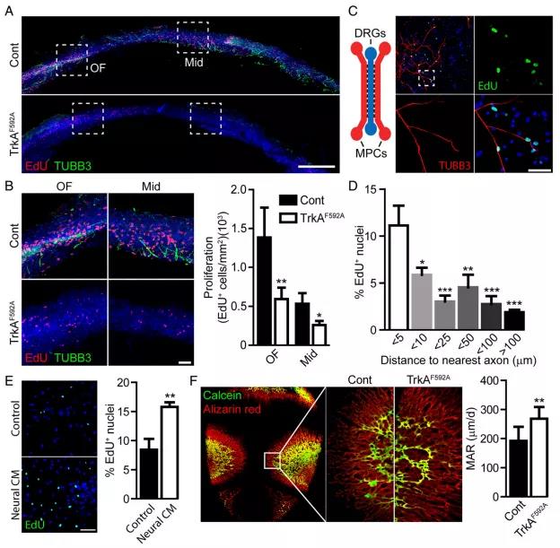 擴散和對照(Cont)和TrkAF592A突變動物的P0矢狀縫的增殖和神經支配,通過EdU標記和TUBB3免疫組化染色可視化。(比例尺,200μm)