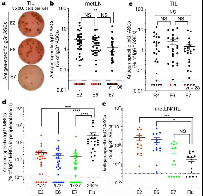 研究者首先從表達(dá)p16的頭頸部鱗狀細(xì)胞癌(HNSCC)患者組織的FFPE切片中提取DNA并檢測(cè)到人乳頭瘤病毒(HPV)的DNA,p16是HPV狀態(tài)的替代標(biāo)志物。接下來,研究者在原發(fā)性腫瘤的腫瘤浸潤性淋巴細(xì)胞(TILs)、轉(zhuǎn)移性淋巴結(jié)(metLNs)和p16+ HNSCC患者中外周血單核細(xì)胞(PBMCs)里計(jì)算抗體分泌細(xì)胞(ASCs)的數(shù)量。與PBMCs相比,TILs和metLNs中ASCs的富集程度更高。隨后研究者嘗試探究腫瘤微環(huán)境(TME)中的ASCs是否產(chǎn)生針對(duì)HPV抗原的特異性抗體。由于TME中IgG+ ASCs經(jīng)常出現(xiàn),故利用經(jīng)典的HPV癌基因E6和E7,和調(diào)節(jié)蛋白E2來研究抗原特異性IgG+ ASCs特征。與宮頸癌不同,E2在大多數(shù)HPV相關(guān)的HNSCC中都有表達(dá)。在所測(cè)試的抗原中,E2的特異性反應(yīng)占主導(dǎo)地位,18例患者配對(duì)的metLN和TIL樣品里HPV特異性IgG+ ASCs的頻率具有相關(guān)性。然而在外周血中檢測(cè)不到HPV特異性的ASCs,說明這是一種區(qū)域性的ASC反應(yīng)。而在p16- HNSCC腫瘤中,淋巴細(xì)胞浸潤程度明顯降低,且缺乏HPV特異性的IgG+ ASCs和IgG+記憶B細(xì)胞(MBCs)。綜上所述,研究者發(fā)現(xiàn)TME中產(chǎn)生的HPV特異性IgG抗體處于活躍狀態(tài),而E2蛋白是體液免疫反應(yīng)的主要靶點(diǎn)。