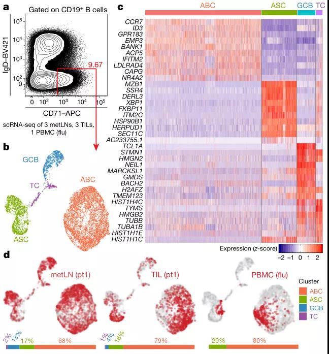 研究者使用單細(xì)胞轉(zhuǎn)錄組測(cè)序技術(shù)從3例HPV+HNSCC患者metLNs和TILs中獲得的純化細(xì)胞測(cè)序分析TME中B細(xì)胞系活化細(xì)胞的組成。此外,研究者還對(duì)一例接種季節(jié)性流感病毒疫苗的健康人外周血中分離出的活化細(xì)胞(接種7天后)進(jìn)行單細(xì)胞轉(zhuǎn)錄組測(cè)序。上述所有單細(xì)胞測(cè)序共獲得8271個(gè)細(xì)胞的結(jié)果,并鑒定到4種細(xì)胞類群,根據(jù)基因表達(dá)譜和基因集富集分析結(jié)果將這4群命名為ABC、ASC、生發(fā)中心B細(xì)胞(GCB)和暫時(shí)性細(xì)胞(表現(xiàn)為ASC、GCB和增殖基因集富集的雜交表型)。雖然這四種細(xì)胞類群中均含有來自metLNs和TILs的活化細(xì)胞,但是在GCB中沒有接種疫苗的健康人細(xì)胞,在暫時(shí)性細(xì)胞里也幾乎沒有。這些結(jié)果表明,TME中包含幾種抗原刺激過的B細(xì)胞類群:ABC、GCB和ASC。