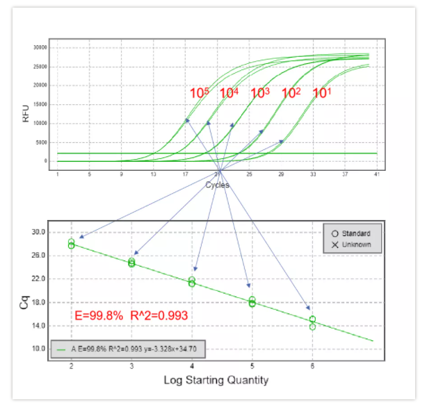 良好的PCR擴增是指數(shù)級的,理論上以100%的效率進行,但實際上并不是所有的PCR反應都表現(xiàn)出相同的高效率,所以需要驗證實際的擴增效率E。當計算評估PCR擴增效率時,至少需要做3次平行重復,并至少做5個數(shù)量級倍數(shù)(5logs)連續(xù)梯度稀釋模板濃度,得到線性方程Cq= -klgX0+b、擴增效率E=10(-1/k)-1。并且E在0.9-1.1之間,即擴增效率在90-110%,被認為此擴增接近理想情況;相關系數(shù)R2值大于0.98時,說明兩個數(shù)值之間相關的可信度很好,可用來計算。