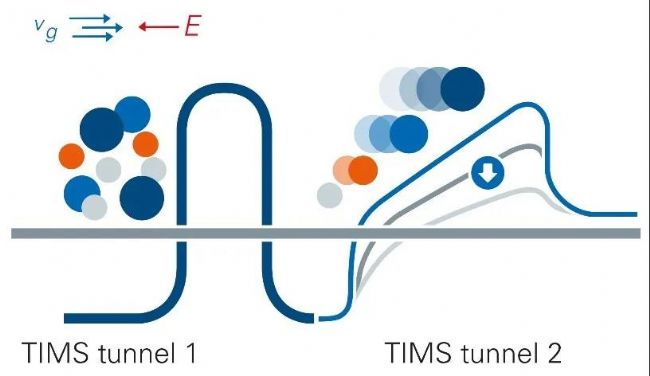 同步累積連續(xù)碎裂(PASEF®)示意圖。timsTOF Pro質(zhì)譜儀的PASEF策略,離子在第一個(gè)TIMS分析器中進(jìn)行累積和聚焦,同時(shí)第二個(gè)TIMS分析器對(duì)肽段進(jìn)行淌度分離和逐步釋放。