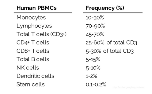 PBMC中大部分都是淋巴細(xì)胞,包括B細(xì)胞和T細(xì)胞,其中CD3 T細(xì)胞又占了淋巴細(xì)胞中絕大部分(45-70%)。這些T細(xì)胞都處于初始(naive)狀態(tài),即已經(jīng)成熟了但沒(méi)有受到抗原刺激。 在正常人中,只有非常小的一部分初始T細(xì)胞會(huì)因抗原識(shí)別而被激活。同樣的B細(xì)胞也都處于初始狀態(tài)。相對(duì)于淋巴細(xì)胞,單核細(xì)胞的比例在10-30%,收到刺激之后會(huì)發(fā)育成樹(shù)突狀細(xì)胞(DC)或巨噬細(xì)胞。干細(xì)胞的比例非常低,只有0.1-0.2%,因此很難從全血樣本中分離到。