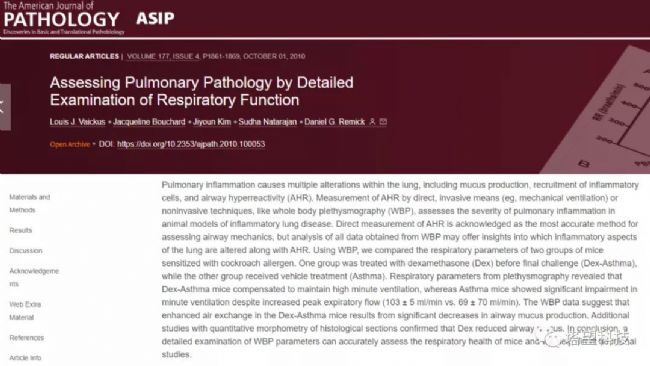 來自馬薩諸塞州波士頓波士頓大學(xué)醫(yī)學(xué)院病理學(xué)系的研究者Louis J. Vaickus等人曾發(fā)表過關(guān)于通過無創(chuàng)手段詳細(xì)檢測呼吸功能以評(píng)估肺病理變化的文章,相關(guān)成果發(fā)表在《The American Journal of Pathology》期刊。其研究團(tuán)隊(duì)直接采用了全身體積描記系統(tǒng)(WBP)對(duì)實(shí)驗(yàn)鼠進(jìn)行了全面的呼吸參數(shù)檢測并進(jìn)行一系列的跟蹤治療研究,研究結(jié)果表明經(jīng)地塞米松(Dexamethasone)治療后,哮喘小鼠的肺功能獲得明顯改善?傊,詳細(xì)的WBP參數(shù)的測定助力于準(zhǔn)確地評(píng)價(jià)實(shí)驗(yàn)動(dòng)物的肺部病理變化和呼吸健康。該研究對(duì)于呼吸類藥物的開發(fā)及治療研究,有著重要的參考借鑒價(jià)值,并有助于指導(dǎo)各種深入性研究。