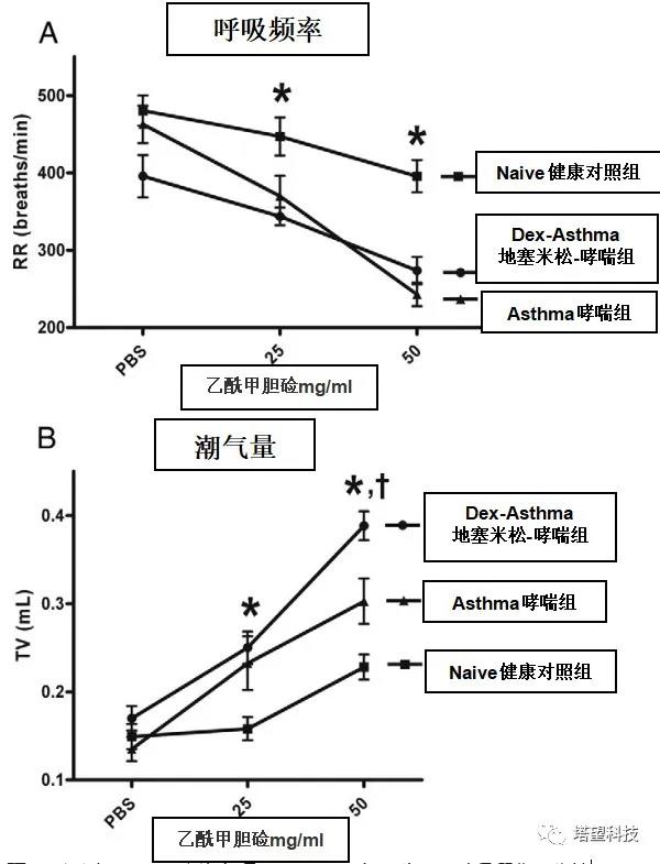 該研究團(tuán)隊(duì)使用了全身體積描記系統(tǒng)(WBP)比較了兩組經(jīng)蟑螂過敏原致敏(CRA)的小鼠的呼吸參數(shù)。其中一組在最后激發(fā)時(shí)使用了地塞米松(Dexamethasone)治療哮喘癥狀組(Dex-Asthma組),另一組則為載體對(duì)照組(Asthma組)。