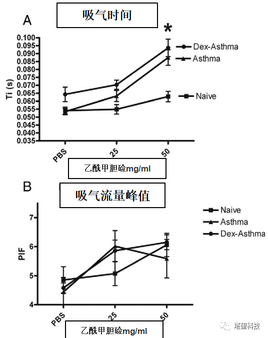 呼吸測量:在最后一次激發(fā)的后24小時(shí),Dex-Asthma組和Asthma組小鼠被放置在無約束的全身體積描記器中,并暴露于25mg/ml PBS、或50mg/ml乙酰甲膽鹼的2分鐘霧化中,緊接著采用WBP全身體積描記系統(tǒng)進(jìn)行5分鐘的記錄。Naïve組小鼠則與其他組小鼠在一天的同一時(shí)間進(jìn)行評(píng)估。所有呼吸參數(shù)由WBP同時(shí)采集、自動(dòng)記錄和導(dǎo)出,過程中無人為操作和干預(yù)。