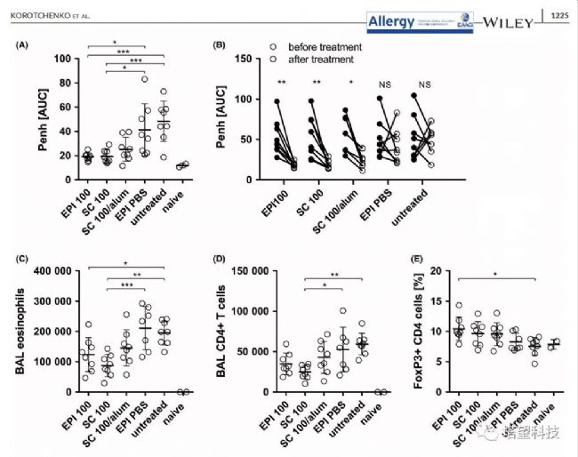 如圖所示,激光表皮免疫療法能顯著改善肺功能,其表現(xiàn)為Penh(呼吸簡寫)的減少,而Penh是WBP測量的與BALB/c小鼠氣道高反應(yīng)性相關(guān)的替代參數(shù)。與其他參數(shù)相似,除色提取液+EPIT和除色提取液+SCIT比使用硫酸鋁鉀+SCIT顯示出更強效的Penh降低(圖6A)。在所有3個治療組中(除假治療或未治療組外),Penh顯比為治療前呈現(xiàn)著降低(圖6B)。這與與細胞浸潤BALF的減少有關(guān)(圖6C和D)。治療還導(dǎo)致BALF中FoxP3 + T細胞的百分比增加,這一比例明顯高于僅EPIT組的未處理小鼠(圖6E)。