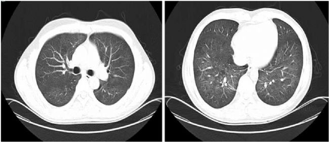 · 血常規(guī)、C反應(yīng)蛋白(CRP)、血沉、降鈣素原、1,3-β-D-葡聚糖測(cè)定和內(nèi)毒素檢查均正常。肺炎支原體、肺炎衣原體、肺炎軍團(tuán)菌、呼吸道病毒和艾滋病毒的血清學(xué)檢測(cè)均為陰性。自身抗體均為陰性。結(jié)核菌素試驗(yàn)呈陰性