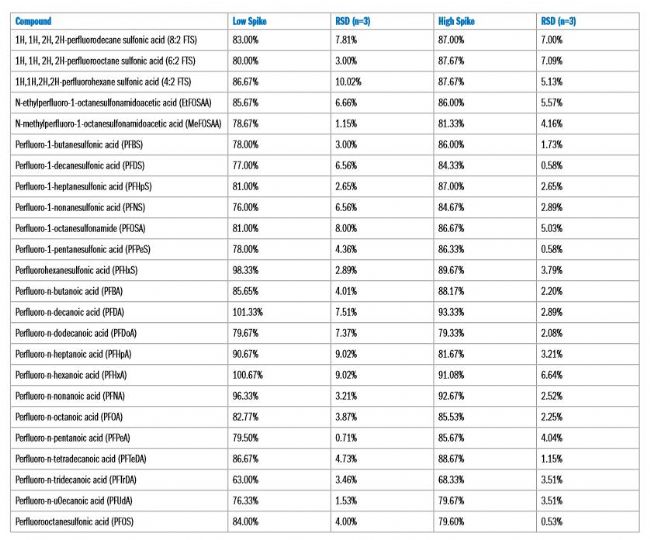 EDGE 對低、中、高濃度加標(biāo)的土壤樣品的提取,單樣品提取時間小于 10 分鐘,并可獲得理想回收率及 RSD 值, 同時,在黃瓜、紙杯蛋糕、微波食品中均檢出 PFAS 物質(zhì)。