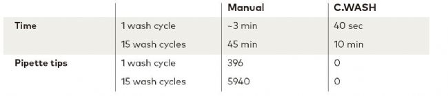C.WASH的所有清洗步驟均在不使用任何槍頭的情況下進(jìn)行,假設(shè)每個孔使用一個槍頭手動移除試劑/洗滌緩沖液,并且每次加清洗緩沖液時使用一組12個槍頭,每次清洗總計396個槍頭,一個384孔板的完整ELISA實驗手動清洗總計需要5940個槍頭,而C.WASH則在整個清洗過程中不需要使用一個槍頭(表1)。