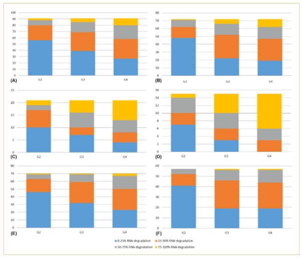 ▲圖1.陽性樣本的RNA隨時(shí)間降解。(A)甲型流感陽性樣本的RNA降解。(B) H1陽性樣本的RNA降解。(C)低病毒載量甲型流感樣本的RNA降解。(D)低病毒載量H1樣本的RNA降解。(E)高病毒載量甲型流感樣本的RNA降解。(F)高病毒載量 H1 樣本的RNA降解。RNA降解=(第1組RNA含量-第n組RNA含量)/第1組RNA含量*100%。Y軸代表樣本數(shù)。藍(lán)色條表示0-25%之間的 RNA 降解,橙色條表示 25%-50%之間的RNA降解,灰色條表示50%-75%之間的RNA降解,黃色條表示 75%-100%之間的RNA降解。
