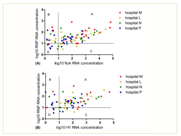▲圖2:樣本采集質(zhì)量評(píng)估。(A)使用甲型流感和RNP參數(shù)評(píng)估樣本采集質(zhì)量。(B)使用H1和RNP參數(shù)評(píng)估樣本采集質(zhì)量。X軸代表流感A M基因(A)或H1 HA基因(B)的Log10 RNA濃度。Y軸代表RNP的Log10 RNA濃度。一個(gè)點(diǎn)代表一個(gè)樣品的結(jié)果。紅點(diǎn)代表M醫(yī)院樣本,黃點(diǎn)代表L醫(yī)院樣本,綠點(diǎn)代表N醫(yī)院樣本,藍(lán)點(diǎn)代表P醫(yī)院樣本。樣本質(zhì)量分為A、B、C、D四個(gè)等級(jí)。