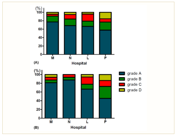 ▲圖3:不同醫(yī)院樣本采集質(zhì)量的比較。(A)不同醫(yī)院甲型流感陽性樣本采集質(zhì)量的比較。(B)不同醫(yī)院H1陽性樣本采集質(zhì)量比較。藍(lán)條代表A級(jí)樣本,綠條代表B級(jí)樣本,紅色條代表C級(jí)樣本,黃色條代表D級(jí)樣本。