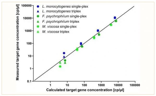 ▲圖3:在1 ng/μl MMC-DNA背景下,單重(圓形)和三重(三角形)測定的靶基因拷貝濃度繪制。恒等線表示每個點的X坐標(biāo)和y坐標(biāo)相等的位置。