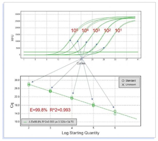 Ct值的范圍為15-35,Ct值小于15,認(rèn)為擴(kuò)增在基線期范圍內(nèi),未達(dá)到熒光閾值。理想情況下,Ct值與模板起始拷貝數(shù)的對(duì)數(shù)存在線性關(guān)系,也就是標(biāo)準(zhǔn)曲線。通過(guò)標(biāo)準(zhǔn)曲線,擴(kuò)增效率為100%時(shí),計(jì)算出基因單個(gè)拷貝數(shù)定量的Ct值在35左右,若大于35,理論上模板起始拷貝數(shù)小于1,可認(rèn)為無(wú)意義。