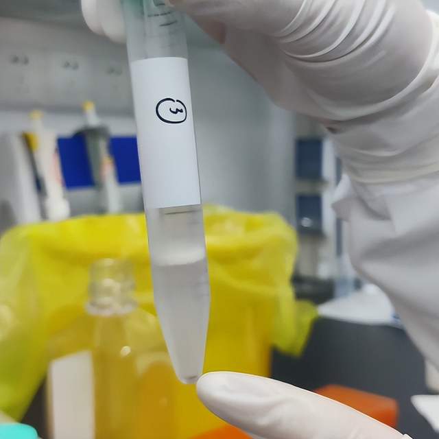 6、轉(zhuǎn)移細胞樣本至15mL離心管,加入去碎片試劑后混勻,上層鋪預(yù)冷的PBS,3000×g, 4℃,升速為5,降速為3,離心10min,保留下層細胞后洗滌收集。