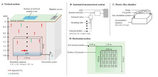 為了觀察降雨前后土壤剖面CO2和地表通量的時間變化與CO2土壤氣體輸運(yùn)之間的關(guān)系,在可控自然環(huán)境下進(jìn)行了兩個不同時期的試驗(yàn)。實(shí)驗(yàn)在160厘米深度的蒸滲儀中注入純 CO2,并在其表面模擬強(qiáng)降雨事件2周。 在整個實(shí)驗(yàn)過程中,連續(xù)監(jiān)測土壤剖面CO2氣體濃度和地表通量。這些測量結(jié)果表明,通過通量室測量的通量與剖面濃度一致。結(jié)果表明,降雨入滲和土壤中CO2的沖刷導(dǎo)致了大氣中CO2通量的顯著下降。