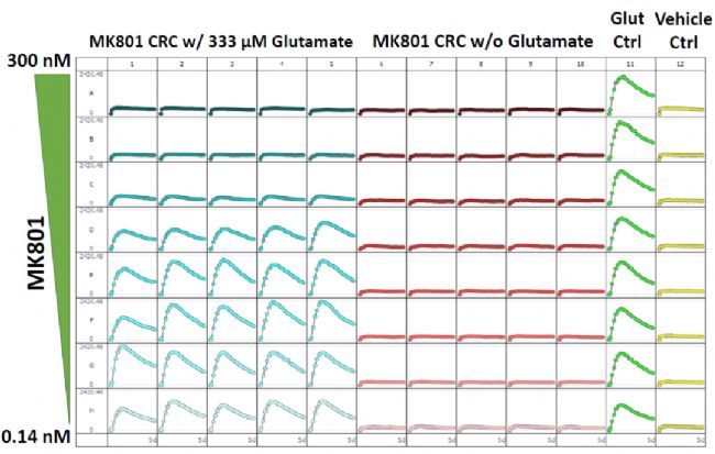 將大鼠前腦原代神經(jīng)元接種在96孔板中,向培養(yǎng)體系中加入333 μM谷氨酸Glutamate,同時(shí)加入Cytotox Red和不同濃度梯度的NMDA受體的拮抗劑MK801,間隔6h采集相差和紅光通道圖片,共檢測(cè)78h。利用標(biāo)準(zhǔn)軟件識(shí)別和定量每個(gè)孔里每個(gè)時(shí)間點(diǎn)采集的圖片里帶紅色熒光即已死亡的神經(jīng)元數(shù)量,以采集的時(shí)間點(diǎn)為橫坐標(biāo)得到每個(gè)孔里死亡的神經(jīng)元數(shù)量隨時(shí)間的動(dòng)力學(xué)曲線圖。從96孔透視圖里可以很直觀地看到各組曲線的差異,且相同加藥組孔間的一致性很高(n=5或8),說(shuō)明檢測(cè)的重復(fù)性很好。