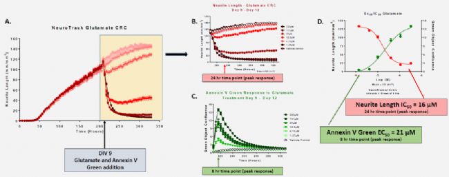 D圖將24h時(shí)神經(jīng)元突起長(zhǎng)度和8h時(shí)Annexin V對(duì)應(yīng)的劑量效應(yīng)曲線合并到一起,橫軸是谷氨酸濃度的對(duì)數(shù)值,前者隨濃度下降,后者隨濃度增加。軟件根據(jù)劑量效應(yīng)曲線擬合出谷氨酸在對(duì)應(yīng)時(shí)間點(diǎn)的IC50=16μM和EC50=21μM。