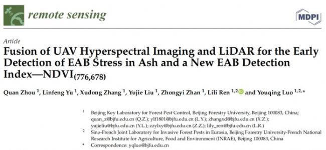 北京百萬(wàn)畝平原造林項(xiàng)目種植了大面積的北美外來(lái)樹(shù)種—洋白蠟。作為一種外來(lái)樹(shù)種,它極易受到中國(guó)本土害蟲(chóng)—白蠟窄吉。‥AB)的危害。在EAB危害早期,洋白蠟沒(méi)有明顯的受害癥狀,危害嚴(yán)重后洋白蠟則會(huì)大量死亡,因此,亟須開(kāi)發(fā)出一個(gè)精準(zhǔn)有效的EAB危害的早期監(jiān)測(cè)技術(shù)以阻止其進(jìn)一步擴(kuò)散蔓延。遙感技術(shù)對(duì)識(shí)別樹(shù)木大尺度生理和形態(tài)變化至關(guān)重要,激光雷達(dá)可以準(zhǔn)確采集物體的三維信息,進(jìn)行單木分割,提取每棵樹(shù)的位置和結(jié)構(gòu)信息,從而對(duì)森林進(jìn)行精準(zhǔn)管理。無(wú)人機(jī)系統(tǒng)的快速發(fā)展極大地增強(qiáng)了激光雷達(dá)在森林健康監(jiān)測(cè)方面的能力。然而,目前尚未有相關(guān)研究將機(jī)載高光譜圖像(UAV-UI)和激光雷達(dá)(LiDAR)相結(jié)合進(jìn)行EAB監(jiān)測(cè)。