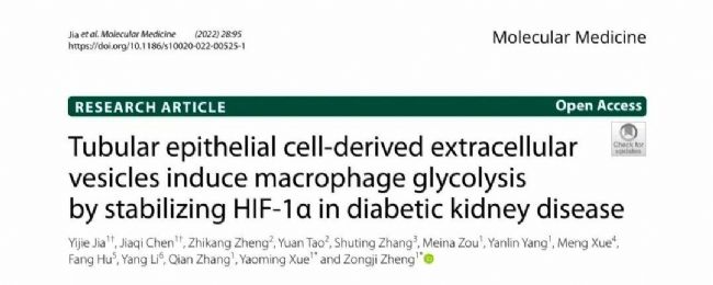 ①Jia Y, Chen J, Zheng Z, Tao Y, Zhang S, Zou M, Yang Y, Xue M, Hu F, Li Y, Zhang Q, Xue Y, Zheng Z. Tubular epithelial cell-derived extracellular vesicles induce macrophage glycolysis by stabilizing HIF-1α in diabetic kidney disease. Mol Med. 2022 ②Aug 12;28(1):95. Doi: 10.1186/s10020-022-00525-1. PMID: 35962319; PMCID: PMC9373297.