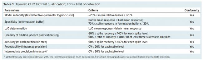 接下來,對Gyrolab CHO-HCP檢測方法進(jìn)行驗證,以確保該方法適用于預(yù)期用途。驗證方案采用與ELISA相同的方法和可接受標(biāo)準(zhǔn);谝呀⒌漠a(chǎn)品/工藝知識和樣品的可用性,在模型適用性(suitability)、專屬性(specificity)、準(zhǔn)確性(accuracy)、稀釋線性度(linearity)、定量限(LoQ)、檢測限(LoD)、重復(fù)性(intra-assay precision)和中間精密度(inter-assay precision)等方面對Gyrolab檢測方法進(jìn)行了驗證。如表1所示,驗證方案中規(guī)定的所有驗收標(biāo)準(zhǔn)均被滿足。
