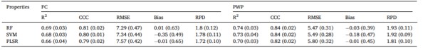 驗證結果表明,與PLSR模型相比,RF和SVM性能較好。與田間持水量(R2=0.66-0.69和RMSE=7.25-7.51%)相比,永久萎蔫點預測良好(R2=0.70-0.74,RMSE=5.44-5.74%)。在土綱中,Vis-NIR光譜(R2=0.34&0.42)對變性土FC和PWP的預測不佳,對淋溶土(0.44&0.52)和弱育土(0.55&0.65)的預測結果一般,而對新成土(0.83&0.76)預測結果較好。總體而言,結果與傳統(tǒng)PTF方法相當。目前結果表明,可見近紅外光譜有助于快速準確地估計該國半干旱地區(qū)的水力特性。