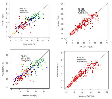 驗證集FC和PWP預測值和觀測值散點圖(RF方法)(變性土-綠點,淋溶土-紅點,弱育土-藍點,新成土-黃點)。傳統(tǒng)PTF方法預測驗證集FC和PWP含水量的性能。