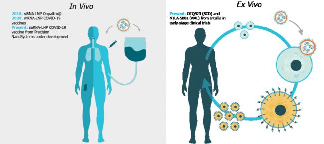 基因遞送平臺需要支持多種多樣的基因策略來開發(fā)新的基因藥物。隨著該領(lǐng)域將重點轉(zhuǎn)向解決新的疾病靶點,并致力于同種異體方法以開發(fā)“現(xiàn)成”的產(chǎn)品來服務(wù)更多的患者群體,需要多重或順序基因操作的工作流程變得越來越普遍。LNP 正在多個基因編輯項目中用于臨床評估。Intellia Therapeutics 公司正在臨床管線中加速推進(jìn)基于LNP CRISPR系統(tǒng)的體內(nèi)和離體產(chǎn)品。OTQ923/HIX763 專注于造血干細(xì)胞的離體基因編輯以治療鐮狀細(xì)胞疾病,而公司領(lǐng)先的、用于治療甲狀腺素運載蛋白 (ATTR) 淀粉樣變性的體內(nèi)基因編輯候選物NTLA-2001,已報道初步臨床結(jié)果頗具前景。