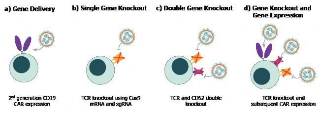 圖 2. LNP 易于整合到離體 CAR-T 細(xì)胞基因工程策略中,包括基因表達(dá) (a)、單基因敲除 (b)、雙基因敲除 (c) 和多步驟基因敲除和表達(dá) (d)。