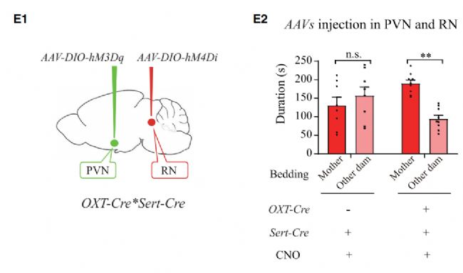將小鼠幼崽暴露在干凈巢穴、其他孕母巢穴、母親巢穴環(huán)境中,光纖鈣成像技術發(fā)現(xiàn)在暴露母親巢穴環(huán)境后中縫背核腦區(qū)5-HT能神經(jīng)元活性明顯增加。此外,免疫熒光實驗發(fā)現(xiàn)室旁核的催產(chǎn)素能神經(jīng)元也明顯被攜帶母親氣味的巢穴激活。