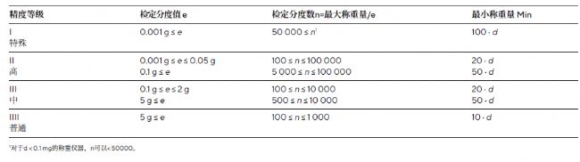 表1:最小稱重量取決于精度等級以及OIML R 76-1:2006規(guī)定的檢定分度值。