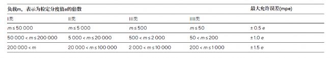 表2:經合格評定的稱重儀器的最大允許誤差取決于OIML R 76 1:2006規(guī)定的精度等級和負載。