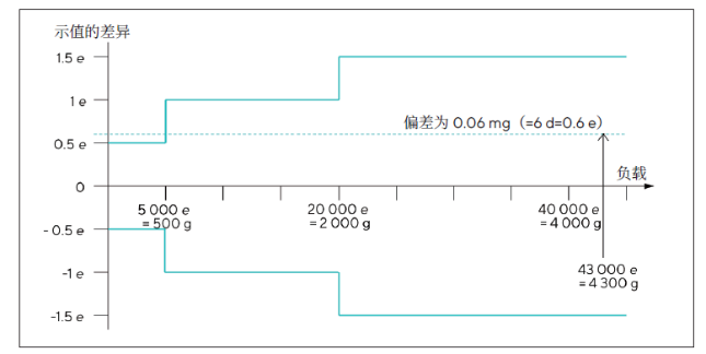 圖3:MCE8202S-2CEU的最大允許誤差(最大稱重量8200 g,最小稱重量0.5 g,e = 0.1 g, d = 0.01 g),精度等級為II級