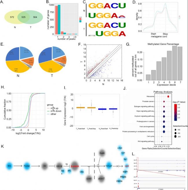 對5個腫瘤組織和正常組織進行m6A-seq分析,發(fā)現(xiàn)五個腫瘤組均表現(xiàn)出高水平的總m6A。m6A-seq在腫瘤組織的1089個基因中鑒定出4071個peaks,對前1000名最重要的peaks值進行分析,發(fā)現(xiàn)在顯著peaks值中至少有兩個motif代表正常組織和腫瘤組織中最常見的consensus。此外研究發(fā)現(xiàn)在正常和腫瘤組織中,m6A-IP在終止密碼子和CDS周圍高度富集,正常組織中CDS(38%)和終止密碼子(26.2%)附近的m6A peaks較多,其次是3’ UTR(19.4%)和起始密碼子(11.2%)。腫瘤中m6A peaks分布在CDS(36.7%)和終止密碼子(29.5%)附近,其次是3’UTR(19.4%)和起始密碼子(11.2%)。