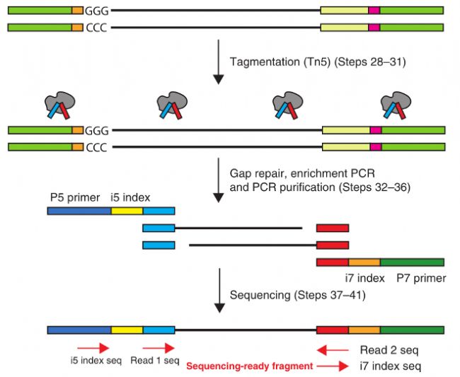 - 標(biāo)記:利用改造后的高活性Tn5轉(zhuǎn)座酶對DNA進(jìn)行打斷的同時將接頭添加到cDNA的兩端。標(biāo)記完成后的DNA片段通常在200-600bp。