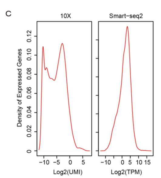 對于檢測到的基因,Smart-seq2數(shù)據(jù)呈單峰分布,在所有細(xì)胞中檢測到的低表達(dá)基因很少。相比之下,10x的數(shù)據(jù)由于有大量的接近零表達(dá)的基因,呈現(xiàn)出明顯的雙峰分布,說明10x數(shù)據(jù)中mRNA在很低的表達(dá)水平上有較高的噪聲或隨機(jī)捕獲。