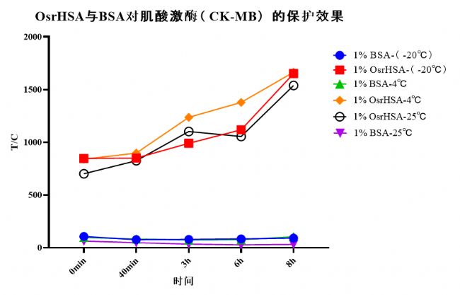 結(jié)論:放置不同時間后,加入禾優(yōu)®OsrHSA作為穩(wěn)定劑,不同溫度下肌酸激酶的T/C(Test值/Control值的比值)信號比值均高于BSA,表明其穩(wěn)定性較好(圖6),且保護效果不隨肌酸激酶的濃度發(fā)生變化。