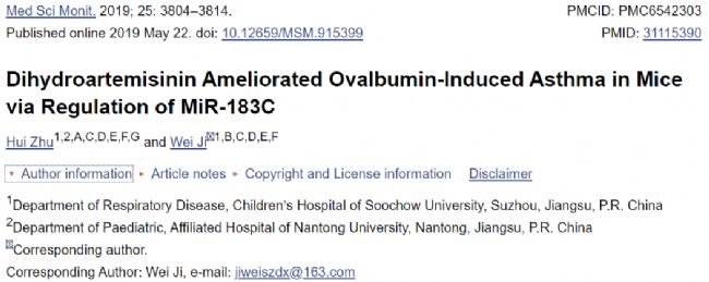來(lái)自蘇州大學(xué)兒童醫(yī)院呼吸內(nèi)科的研究人員在《MedicalL Science Monitor》期刊上發(fā)表了題為“Dihydroartemisinin Ameliorated Ovalbumin-Induced Asthma in Mice via Regulation of MiR-183C”的論文。