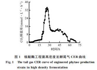 在山東省科學(xué) 院 生 物 研 究 所 承 擔(dān) 的“植 酸 酶 工 程菌高密度發(fā)酵智能控制關(guān)鍵技術(shù)”(山東省重點(diǎn)研 發(fā)計(jì)劃項(xiàng)目 2016ZDJS07A20) 項(xiàng) 目 中,在 10L 實(shí) 驗(yàn) 室發(fā)酵罐上,采用 FGA 發(fā) 酵 尾 氣 分 析 儀,對(duì) 重 組 畢 赤酵母表達(dá)植酸酶過(guò)程進(jìn)行實(shí)時(shí)在線檢測(cè) 。 發(fā)酵溫 度 30 ℃,初 始 發(fā) 酵 液 體 積 7L,通 氣 量 5L/min,攪拌轉(zhuǎn)速 200r/min 。 發(fā)酵 6h5min 時(shí),CER 開(kāi) 始 緩 慢上升;發(fā) 酵 25h26 min 時(shí),CER 出 現(xiàn) 快 速 上 升, 曲線上形成明顯的 臨 界 點(diǎn),預(yù)示發(fā) 酵進(jìn)入對(duì)數(shù)生長(zhǎng) 期,此時(shí) 立刻調(diào)整攪拌轉(zhuǎn)速至 400r/min;之 后 隨 著 CER 的上升,階段性小步調(diào)整攪拌轉(zhuǎn)速達(dá) 530r/min, 并保持至 發(fā) 酵 48h30 min,之 后調(diào)整攪拌轉(zhuǎn)速至 500r/min,直至 發(fā) 酵 結(jié) 束 。 該 發(fā) 酵 過(guò) 程 的 CER 變 化曲線如圖 1 所示 。在該過(guò)程中,發(fā) 酵 15h 時(shí) 進(jìn) 行 甲醇誘導(dǎo),誘 導(dǎo) 5h 后 開(kāi) 啟 蛋 白 表 達(dá),SDS-PAGE 檢 測(cè)植酸酶表達(dá)見(jiàn)文獻(xiàn)[18],最終酶活達(dá) 3 000U/mL。