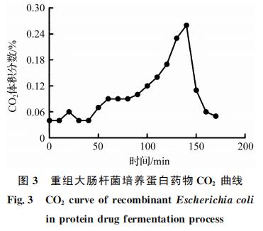 在廣東某高校進(jìn)行的重組大腸桿菌發(fā)酵 藥 物 蛋 白實(shí)驗(yàn)中,發(fā)酵開(kāi)始后,經(jīng)過(guò)短暫的遲緩期,CO2 曲線 開(kāi)始緩慢上 升,約 2h 后 發(fā) 酵 快 速 進(jìn) 入 對(duì) 數(shù) 生 長(zhǎng) 期; 20min后,CO2 曲 線 突 然 出 現(xiàn) 了 下 折,CO2 體積分?jǐn)?shù) 迅速下降,在不到 30min 的時(shí)間內(nèi)下降到接種前水平, 鏡檢觀察,發(fā)現(xiàn)此時(shí)發(fā)酵液中的工程菌已經(jīng)消失,判斷 感染了噬菌體,隨即停止發(fā)酵,并迅速進(jìn)行滅菌處理。 該實(shí)驗(yàn)過(guò)程的 CO2 體積分?jǐn)?shù)變化曲線如圖 3 所示。