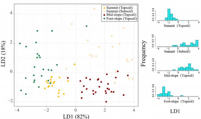 基于此,在本研究中,由吉林大學(xué)地球科學(xué)學(xué)院、魯汶大學(xué)地球與生命研究所、中國(guó)農(nóng)業(yè)科學(xué)院農(nóng)業(yè)環(huán)境與可持續(xù)發(fā)展研究所組成的一組研究團(tuán)隊(duì)以中國(guó)東北吉林省中部德惠市木石河流域(44°34′-44°38′N,125°51′-125°59′E,面積約46.20 km2)為例,進(jìn)行土壤取樣與分析(共選取72個(gè)采樣點(diǎn),其中山頂19個(gè),斜坡中段28個(gè),山腳25個(gè));在實(shí)驗(yàn)室內(nèi)使用ASD Fieldspec 3 FR光譜儀測(cè)量土壤樣品VNIR光譜數(shù)據(jù);建立地面真實(shí)數(shù)據(jù)集;結(jié)合主成分分析和綜合光譜判別分析(PCA-LDA)方法對(duì)實(shí)驗(yàn)室高光譜數(shù)據(jù)進(jìn)行測(cè)試與分析、研究不同侵蝕影響下土壤的光譜可分性;建立侵蝕分類方案、創(chuàng)建混淆矩陣,通過Kappa系數(shù)評(píng)估分類性能;最后通過多時(shí)間裸土像素合成方法,優(yōu)化裸土反射率穩(wěn)定性,基于哨兵-2衍生的寬帶光譜對(duì)研究區(qū)土壤侵蝕情況進(jìn)行測(cè)繪與驗(yàn)證。