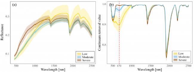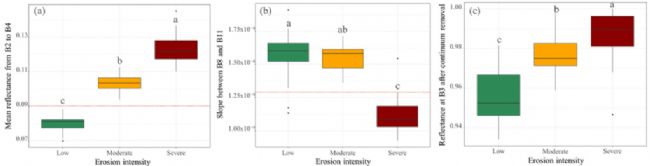 本研究在中國(guó)東北黑土區(qū)流域尺度上測(cè)試了多時(shí)間遙感探測(cè)侵蝕熱點(diǎn)的潛力。建立了一個(gè)地面真實(shí)數(shù)據(jù)集,包括在山頂、中坡和腳坡位置收集的土壤,由于其地形特征、凈侵蝕率和SOC含量的差異,對(duì)應(yīng)于中、重度和低侵蝕程度類別。對(duì)實(shí)驗(yàn)室和基于哨兵-2的土壤光譜數(shù)據(jù)的調(diào)查表明,由于侵蝕引起的土壤反照率和生化組成的變化,三個(gè)侵蝕類別中的土壤顯示出明顯的光譜特征,特別是在嚴(yán)重侵蝕的地區(qū),其表土層明顯有大量土壤損失。