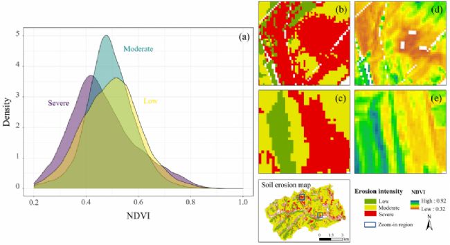 2021年6月,農(nóng)田范圍內(nèi)三個(gè)侵蝕強(qiáng)度等級(jí)的NDVI密度圖;(b,c)是詳細(xì)土壤侵蝕模式的放大區(qū)域,(d,e)相應(yīng)的田間尺度NDVI圖。